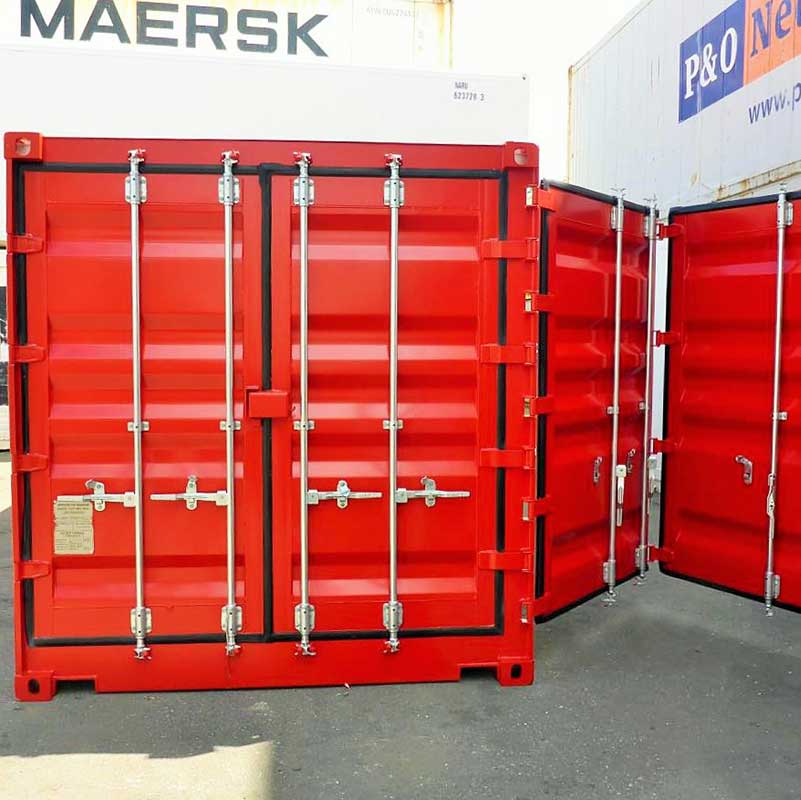 Los contenedores Open-Side se pueden abrir mediante aberturas de varias hojas en la pared lateral. La carga y descarga de objetos voluminosos, máquinas y automóviles se simplifica gracias a la abertura adicional.